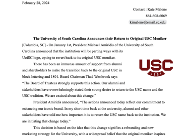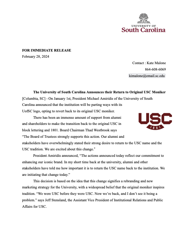Through research and clear, compelling messaging, this press release effectively communicates the university’s rationale behind the transition. By incorporating statements from key leadership and contextualizing the historical significance, the project successfully informs stakeholders and reinforces USC’s renewed brand direction.