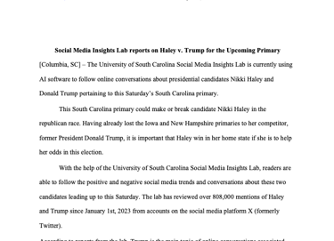This project highlights the University of South Carolina Social Media Insights Lab’s role in analyzing online conversations surrounding the South Carolina primary, particularly regarding candidates Nikki Haley and Donald Trump. The objective is to showcase the lab’s ability to track sentiment, monitor trends, and provide data-driven insights on political discourse using AI-powered software.